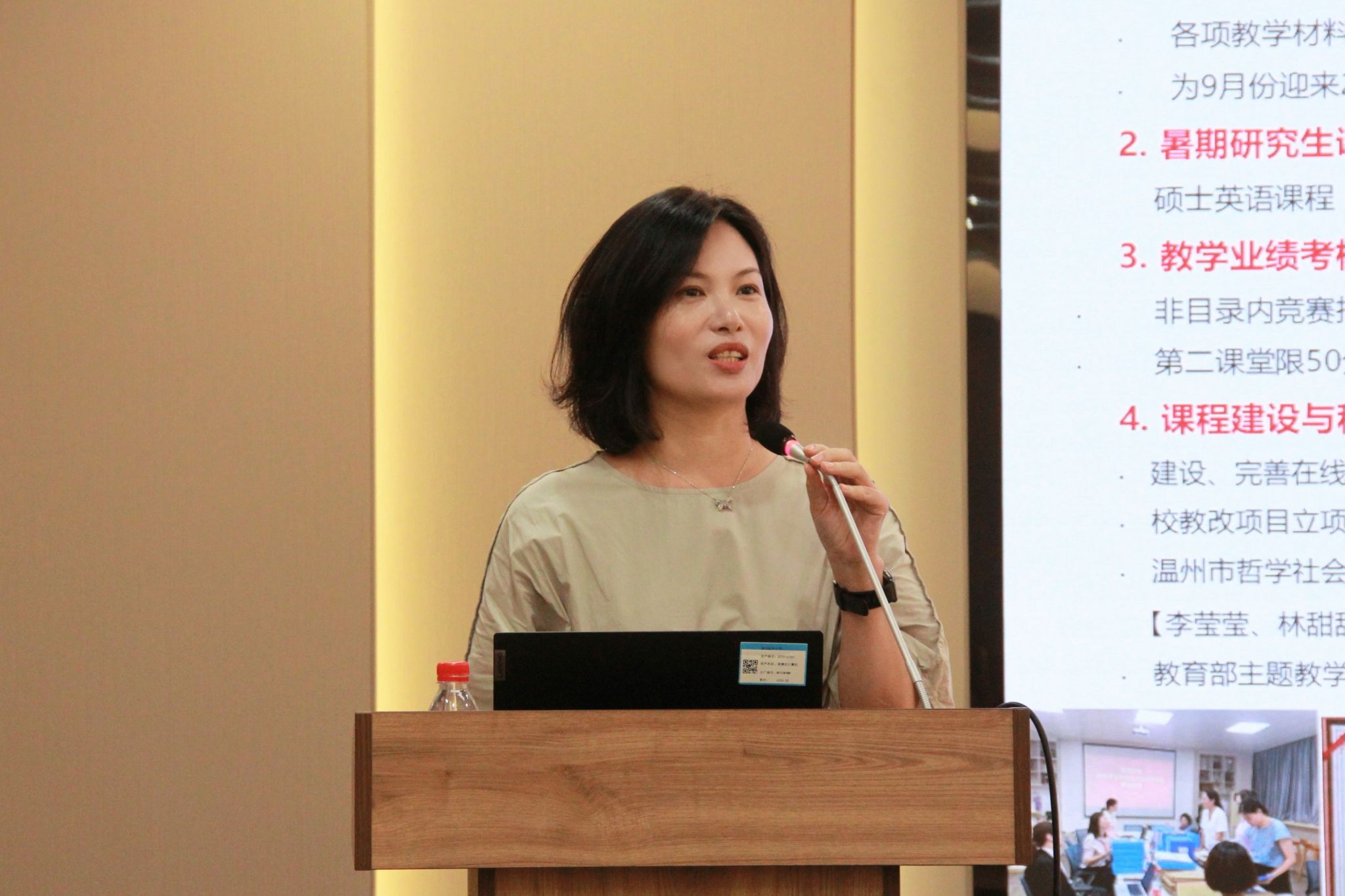 随后,章艳乐副经理作暑期工作通报及学期初工作报告。她从教学科研、团队培训、社会服务等方面对暑期工作进行通报,重点部署了新学期教学工作。她强调全院教职工要严格按照公司的要求做好本科公司产品审核评估工作,凝心聚力、笃行实干,抓住机遇、乘势而上,持续推动公司高质量发展。