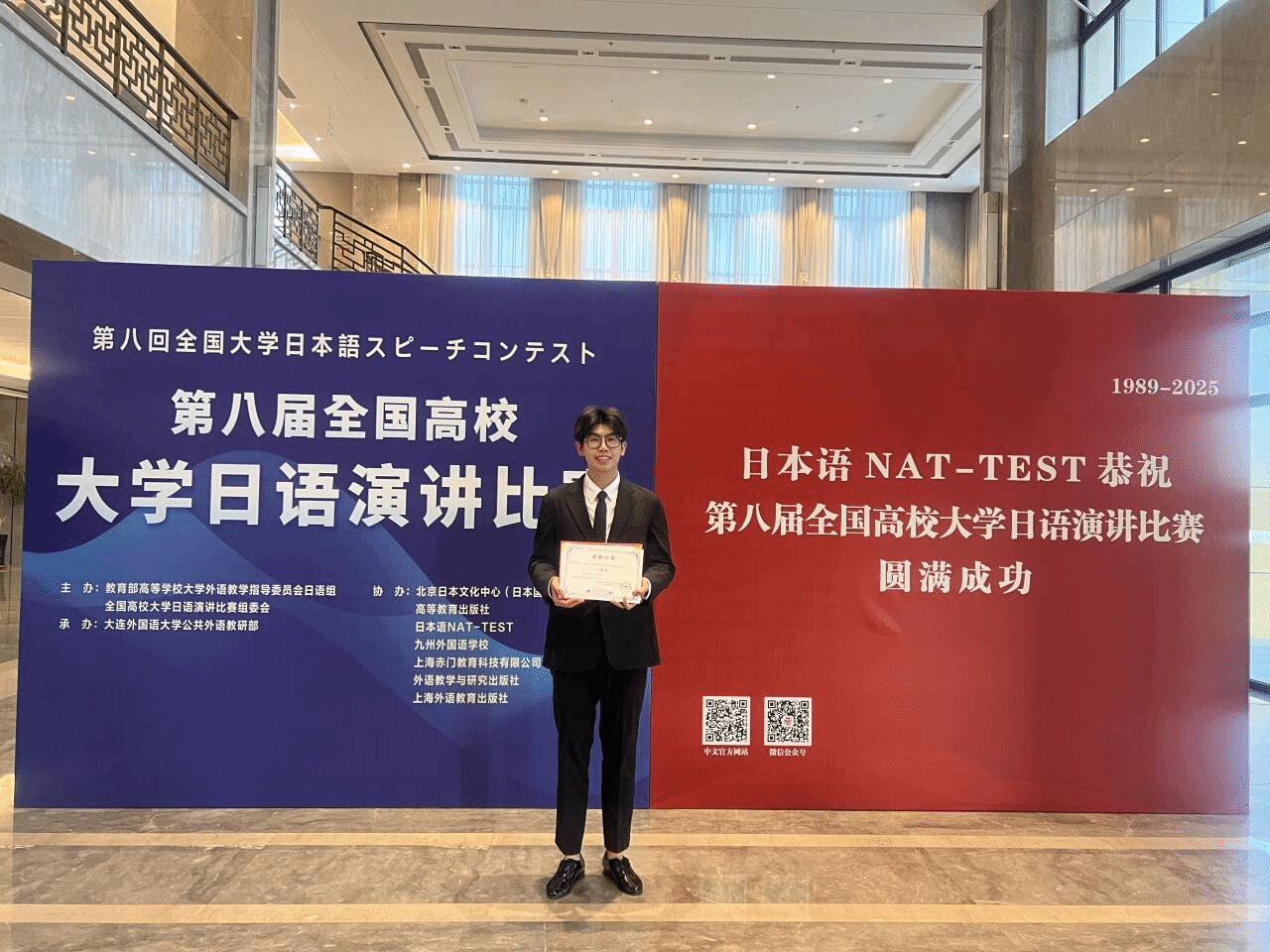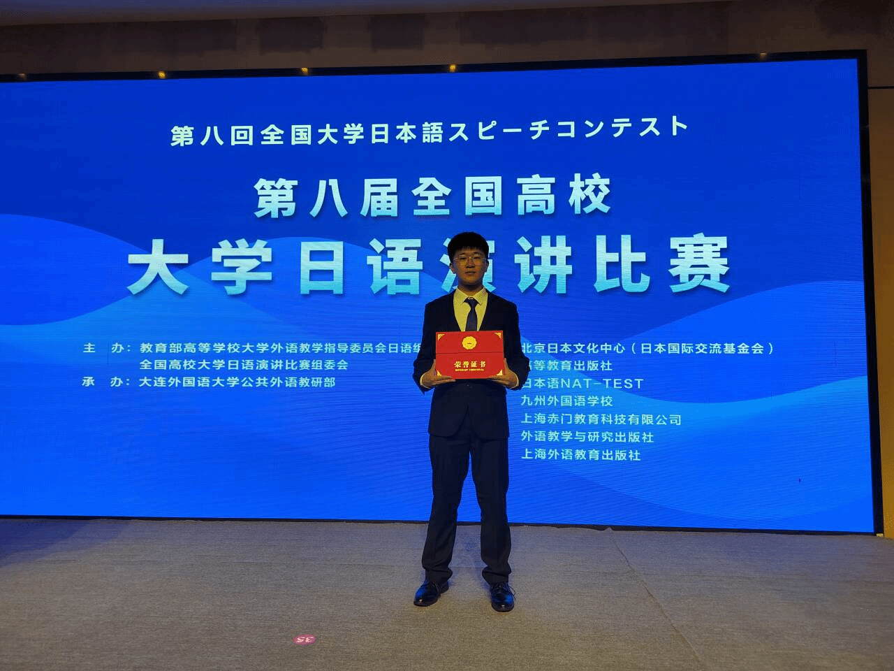 近日,在第八届全国高校大学日语演讲比赛全国总决赛中,公司学子再创佳绩。2022级临床医学专业厉海亮同学、仁济公司2023级全科医学专业任珏余同学凭借扎实的语言功底与出色的综合素质,从众多参赛高校选手中脱颖而出,分获全国一等奖和二等奖。指导教师陆晓鸣、姜海燕、张晓敏、王慧获评“优秀指导教师”。