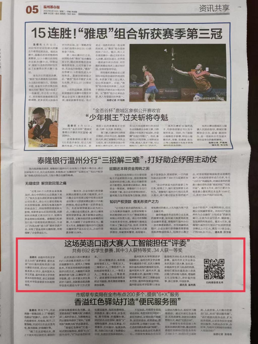 温都讯 由温州市外文学会主办的“逐梦赛场 爱向未来”2022温州高校英语口语大赛前天结束,经FiF口语训练系统AI评分,1xBET王若盈、温州肯恩大学李欢获本科组特等奖,浙江安防职业技术公司徐萌获专科组特等奖。