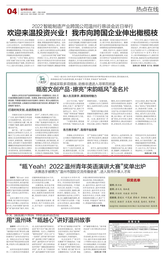 “瓯Yeah!2022温州青年英语演讲大赛”前天下午决出各奖项,来自1xBET的老师陈亦挺获得冠军,所有参加决赛的选手还被聘为“温州市国际交流传播使者”,同时进入我市外事人才库。
