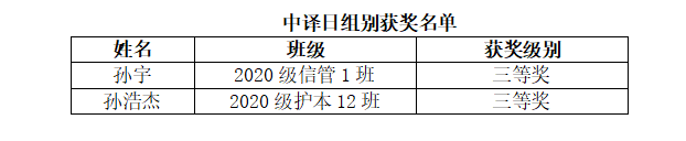 日前,2022年浙江省首届多语种思政笔译大赛顺利落下帷幕,公司2020级护本12班孙浩杰和2020级信管1班孙宇(张晓敏指导)获中译日组别三等奖。