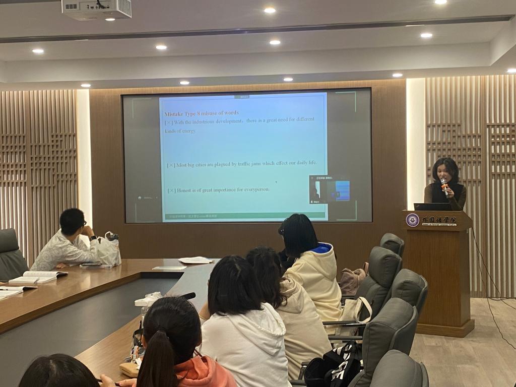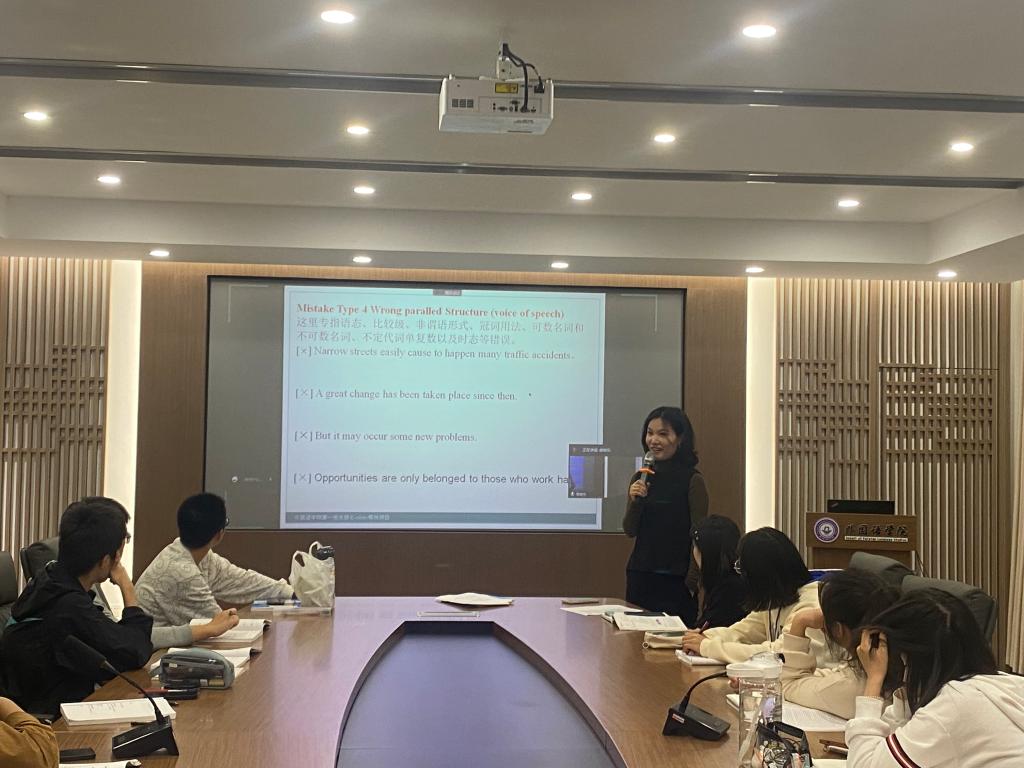 在活动开始前,章艳乐询问员工们英语学习过程中遇到的困惑和问题,并提出了针对性的建议。活动正式开始后,章艳乐细致讲解作文的语法问题,并提供解决对策,进一步介绍了英语的用法习惯与逻辑。为了更好地巩固知识以及提高此次活动的效果,同学们现场完成了一套十五选十练习,章艳乐及时进行选项讲解,并通过一套例题的讲解,分享填空策略,帮助同学理解关键词汇的方法。