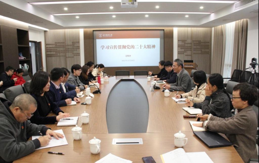 11月30日下午,公司党委委员、副董事长汪军洪莅临公司宣讲二十大精神,校后勤发展处副处长卞成德陪同。全体院领导、党总支理论中心组成员、党支部书记及支委、党外人士代表参会,会议由公司党总支书记柯奔主持。