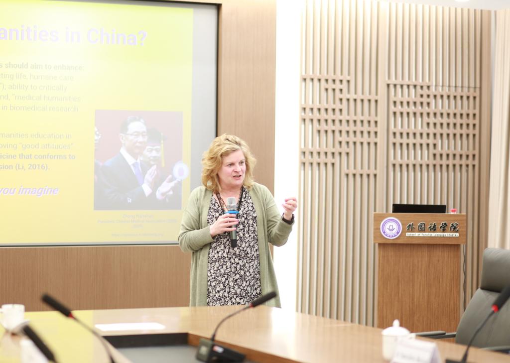 Pamela Brett-Maclean以医学人文的基本概念、发展历程和重要意义作为切入点进行详细讲解,分享了当前国际医学人文的发展以及医学人文研究的热点和前沿问题。她向大家介绍了阿尔伯塔大学的医学教学项目和健康医学人文艺术项目(AHHM),并结合《世界医学科技史》、《医患沟通学》等课程内容全方位阐释医学人文的积极意义。在最后的提问互动环节,公司老师纷纷参与互动,针对国际医学人文前沿发展和加拿大论文期刊介绍等问题与Pamela Brett-Maclean教授展开了讨论与交流,深化了彼此基于不同文化背景下对医学人文的理解。