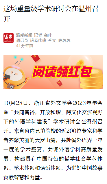 10月28日,浙江省外文学会2023年年会暨“共同富裕,开放和谐:跨文化交流视野下的外语团队建设”学术研讨会在温州召开。来自省内兄弟院校的近200位专家和学者齐聚美丽的大罗山麓,共赴省外语界一年一度的学术盛宴,共谋外语学科高质量发展,构建具有中国特色的哲学社会学科体系、学术体系和话语体系,为讲好中国故事贡献智慧和力量。