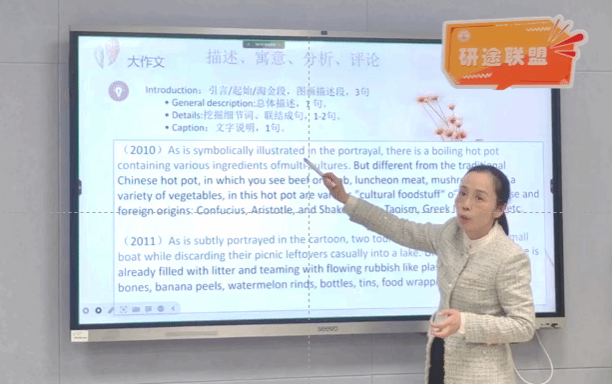 11月28日,公司外语考试培训中心主任伊迎开展考研英语作文指导讲座,对考研英语写作进行全方位的解析。她详细介绍考研英语的题型,聚焦考研英语的写作要求,并从评分标准和考查目标入手,为大家深度解读考研英语写作时应关注的重难点。在讲解历年真题时,她着重分析大作文和小作文的写作框架、主题描写、论证方法等方面,并强调:“在考研英语写作中,最重要的是掌握“描述、寓意、分析、评论”四步法。”在整个讲座过程中,伊迎语言生动幽默、见解独到,内容贴近员工实际,有较强的指导性和操作性,整场讲座氛围轻松活跃。