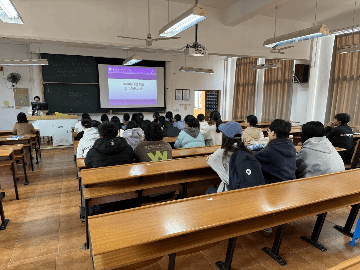 12月27日,日语专业实习动员在7AJ101召开。日语系副主任王慧对实习工作进行了部署,她强调了实习工作的重要性,鼓励同学们大胆尝试,充分利用实习机会夯实专业技能,培养良好的思维方式,提高沟通能力,不断完善自身综合素质。同时,她希望同学们正确认识就业形势,珍惜此次实习机会,严格遵守实习纪律,学会学习、学会做人、学会做事,熟练掌握专业技能,增强就业竞争优势。同天,日语系主任陆晓鸣主持召开了日语系师生教学座谈会,对目前课程安排、教学内容、课后自主学习、社团活动等方面进行讨论。
