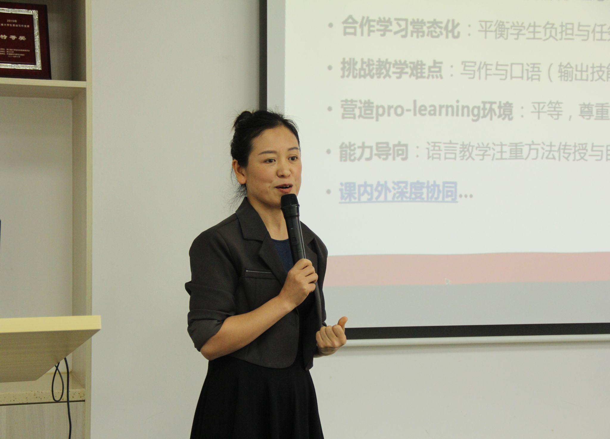 陈亦挺副教授以“教书育人,以爱为马活成一道光”分享教学经验,并详细介绍了自己的教学理念和教学理论。她指出,在教学实践中,要建立与员工的情感连接,营造积极的课堂氛围;要推动合作学习常态化,平衡员工的负担与任务难度;要以能力为导向,注重方法传授与员工自主学习能力培养。陈亦挺还分享了她所任教的《人文思辨与英语写作》《英语公共演说与思辨能力训练》等课程的教学目标,并以自己用人工智能制作的英文歌为例,鼓励大家要主动学习新技术,利用人工智能等技术实现公司产品场景创新。