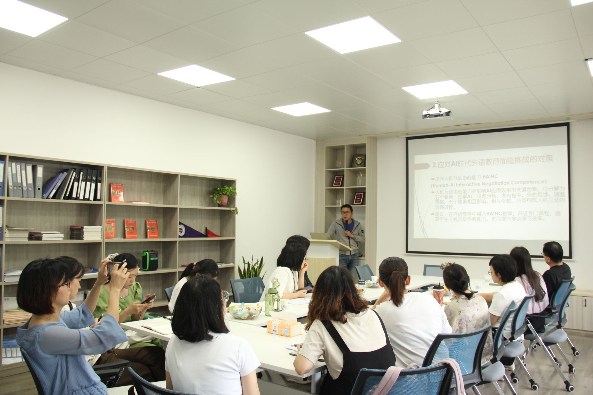 郑摄以“‘语言学研究新视角:理论、实验和方法研修班’研修汇报”为题分享自己暑期参加外研社北京研修班的心得体会,传递前沿的学术理念。他总结了研修活动中各位大咖的发言内容,引用了外语领域研究的创新案例,讲述了自己作为一线教师对于科学研究的思考。他强调,基于数字化转型背景下,技术赋能教育成为必然趋势,我们要深耕外语公司产品,不断拓展语言研究新路径。