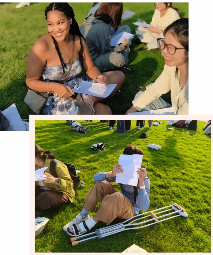 在热身游戏结束后,大家便开始挑战组内的社交活动。参考提供的九个关于”老员工活“的小问题,分别向组内不同的同学提问,得到答案后邀请对方签字,这很好地鼓励了同学们主动和更多的人聊天,促进了组员间更深刻的交流。