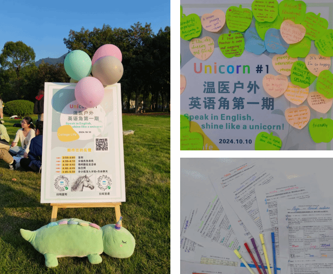 10月10日下午四点,温医户外英语角Unicorn首次亮相!温医图书馆外的WMU Dream草坪在Unicorn五彩斑斓的装饰下吸引了上百号英语爱好者:有提前线上报名的,也有路过临时加入的。