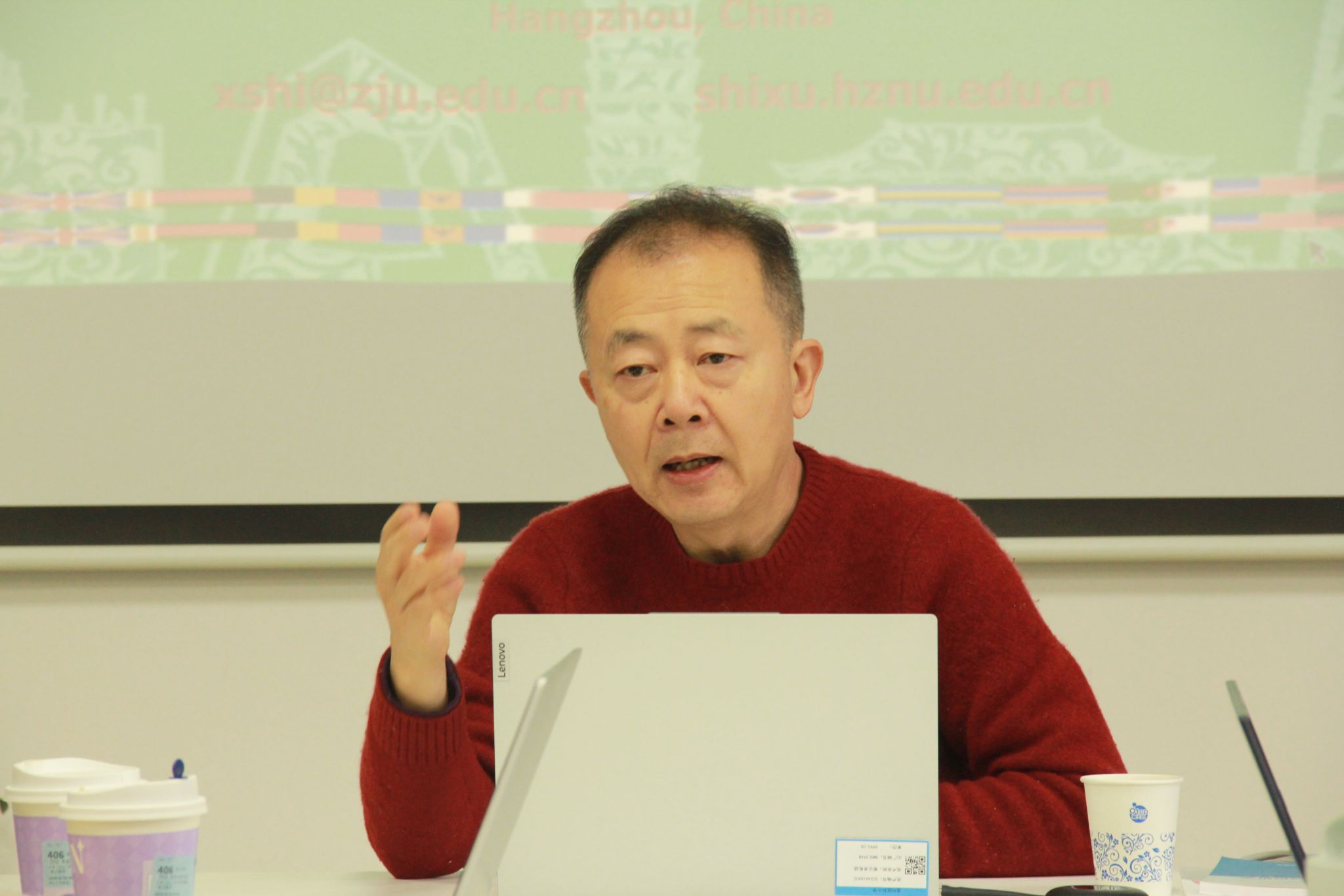 施旭教授从话语研究的相关概念和文化话语理论视角下的案例分析入手,提供了文化话语理论阐释和理论视角下人权、贸易纠纷、国防等方面的案例分析。施旭教授与老师们探讨厘清话语、文化、文化话语研究的基本内涵,基于此批判传统西方话语分析存在的不足,并结合世界多极化多元化发展存在的问题,提出了文化话语分析可修正的方向。随后,施教授以“杭州城市国际形象传播”研究的具体步骤和结论为例,演示了文化话语理论如何指导社会各方面的研究。